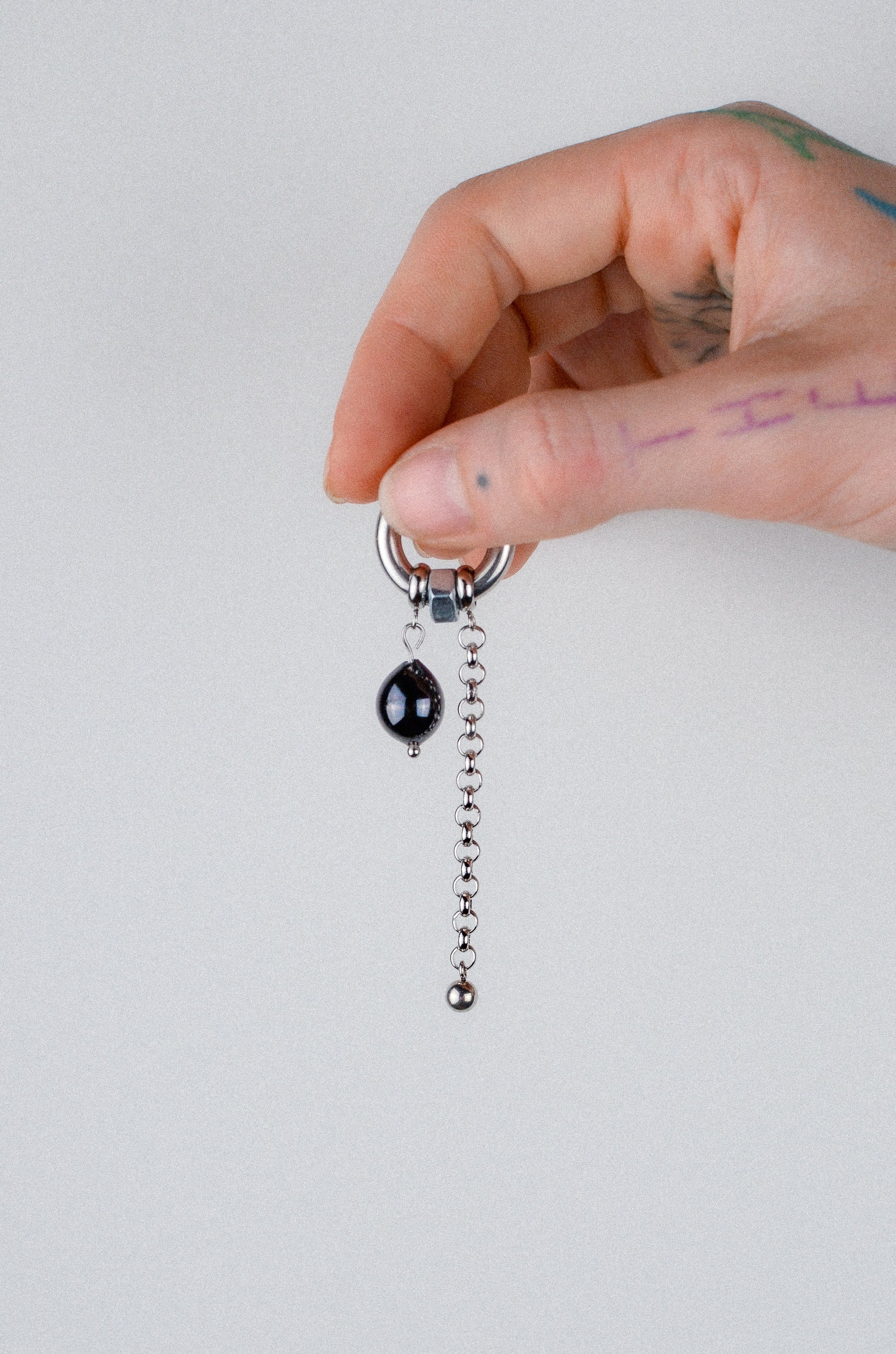 Anneau avec perle en verre, boulon et chaîne.