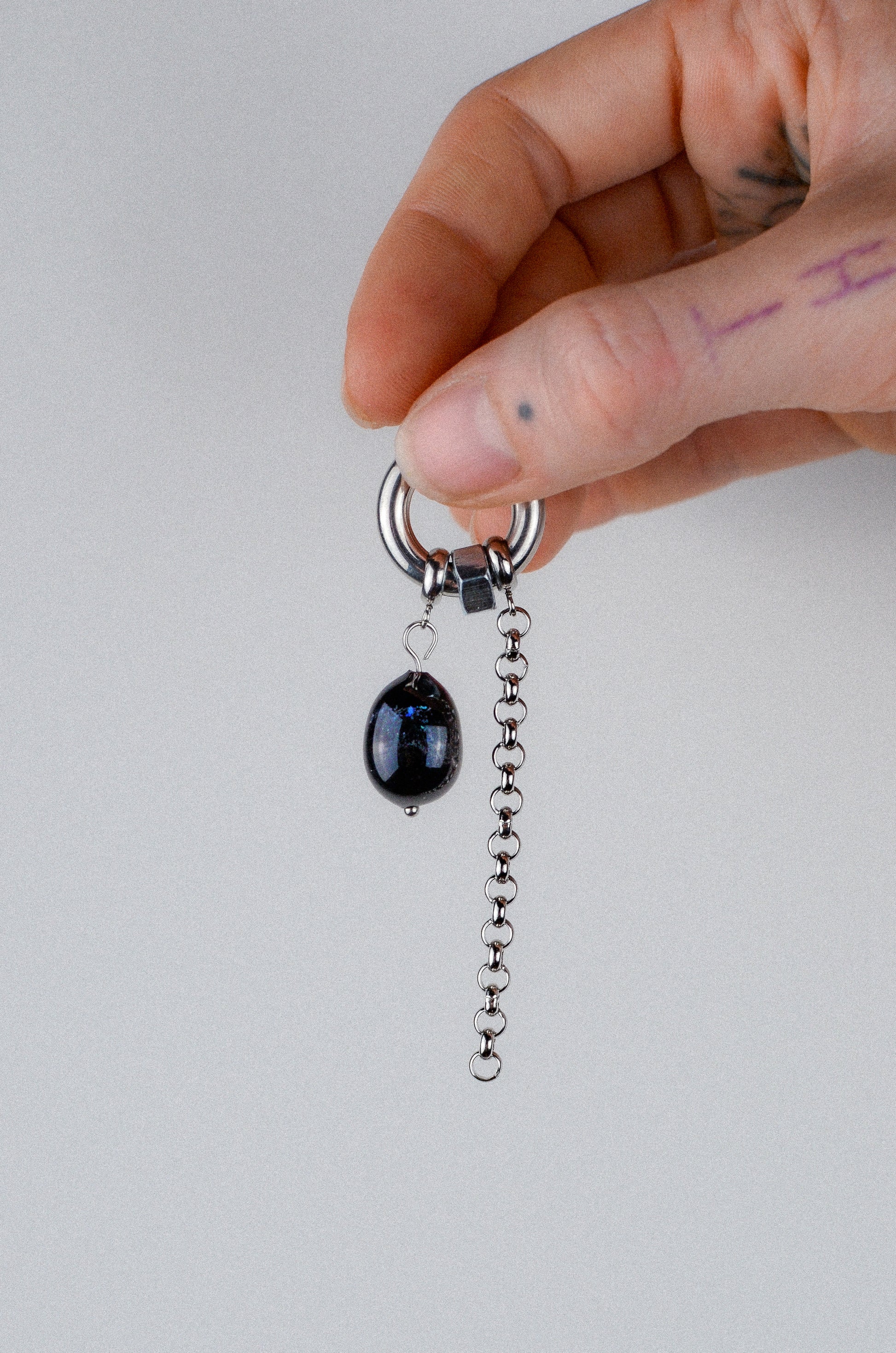 Anneau avec perle en verre, boulon et chaîne.